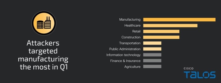 Il settore manifatturiero è risultato il più colpito, con il 25% degli incidenti gestiti da Cisco Talos. Tale dato assume particolare rilevanza se confrontato con il secondo semestre del 2024, quando il principale bersaglio era stato invece il settore dell’istruzione, mentre nel trimestre attuale non si sono riscontrati incidenti diretti a organizzazioni appartenenti al comparto educativo.