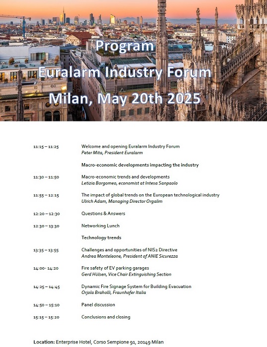Euralarm Industry Forum 2025 will be held on May 20 in Milan (Italy), at the Enterprise Hotel, Corso Sempione 91, and will focus around macro-economic trends and their impact on the fire safety and security industry and the latest technological developments for enhanced fire safety and security.