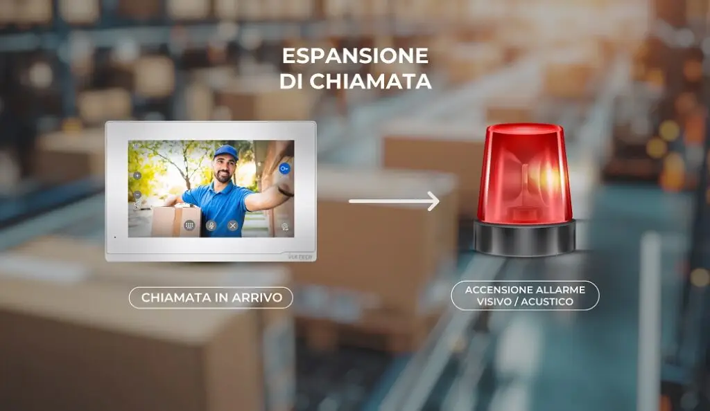 Nei contesti industriali, nei grandi uffici o in ambienti molto rumorosi, il rischio di non accorgersi di una chiamata in arrivo è elevato. I monitor IP VulTech Security risolvono questo problema grazie alla funzione di espansione della chiamata, che permette di generare un’azione in uscita ogni volta che viene ricevuta una chiamata. In questi casi il sistema può attivare una sirena lampeggiante o un segnalatore acustico ausiliario. In tal modo, la chiamata in ingresso non passerà mai inosservata. Questa funzione può essere molto utile anche per chi è affetto da problemi di udito.